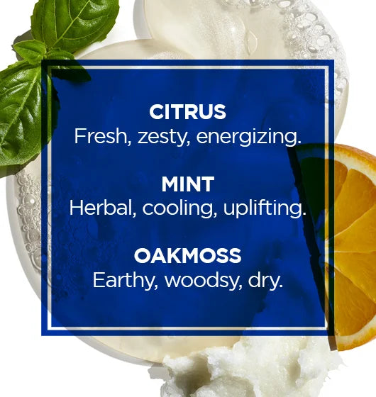 Citrus, Mint, and Oakmoss combine to leave a fresh, light scent and pH balanced cleansers are gentle enough for face, hair, and body.