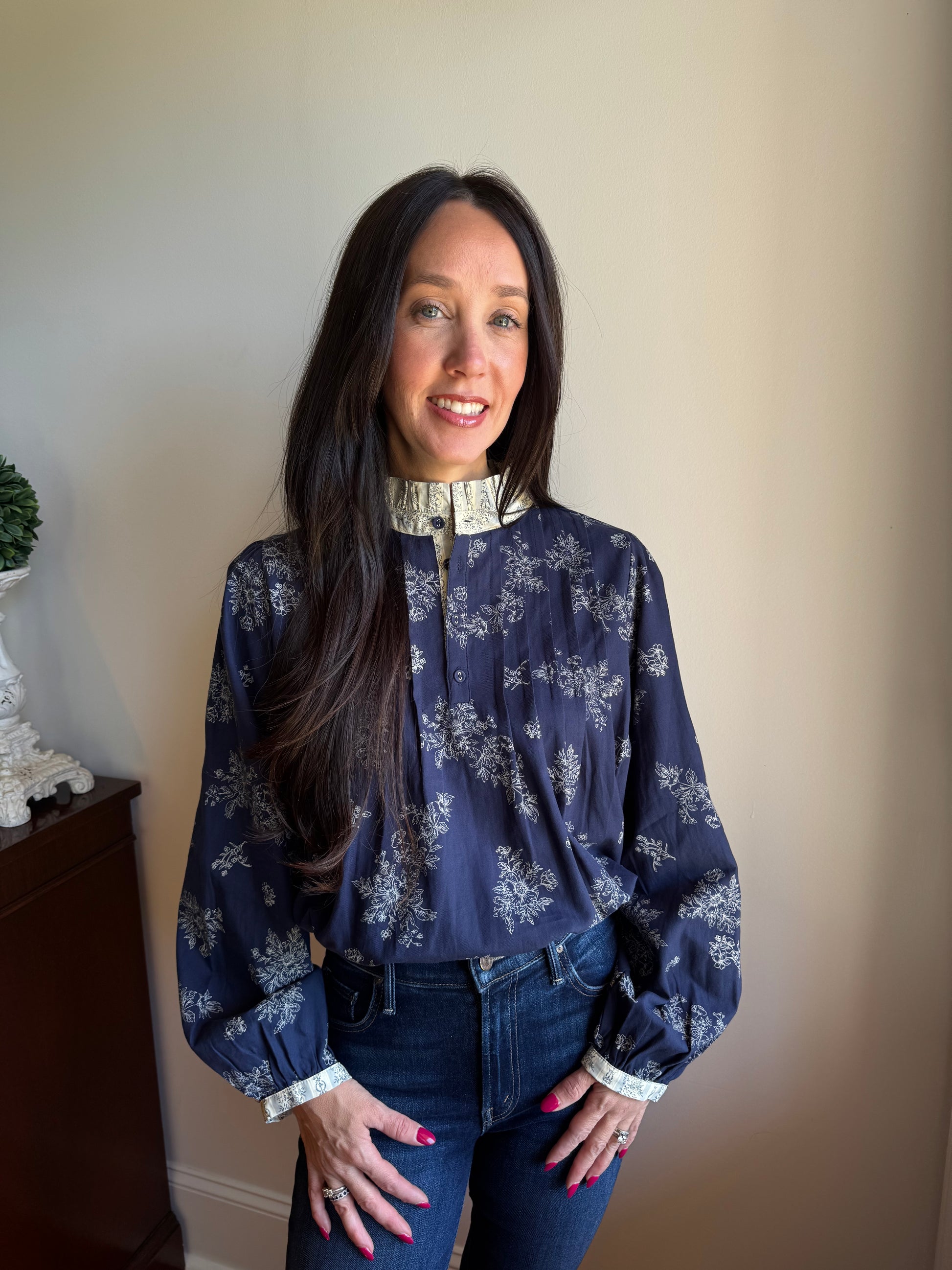 The Josie Blouse features a navy base adorned with delicate ivory florals, finished with a ruffled contrast collar and cuffs.