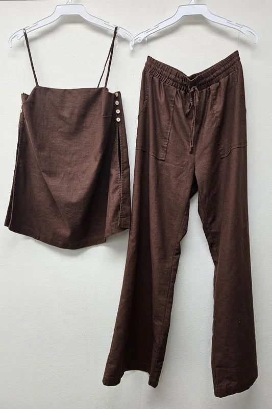 This linen set has side slits and coconut button closure cami top with matching pants.