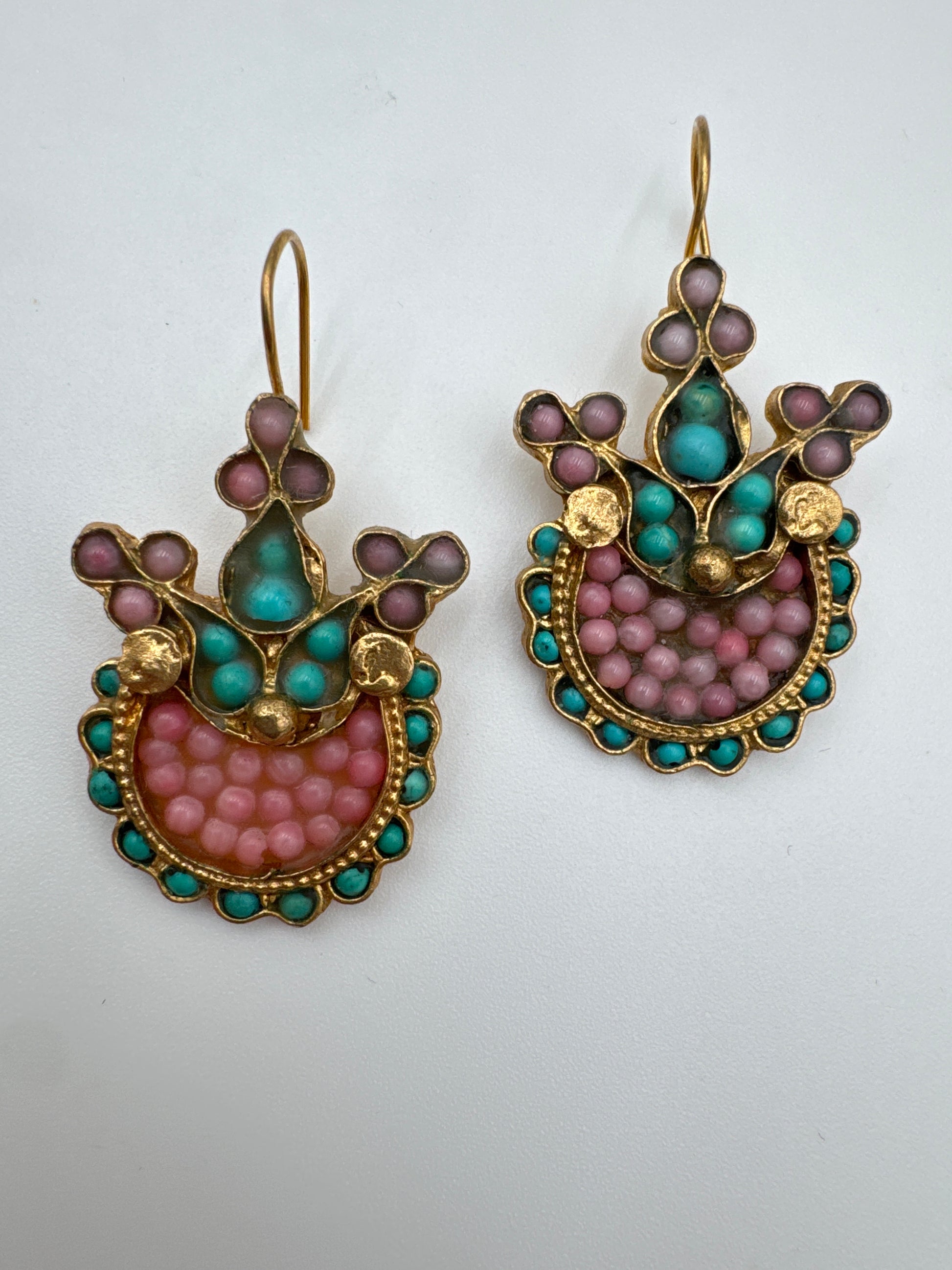 A beautiful blend of vintage charm and artisan detail. These statement earrings feature an intricate gold-tone setting adorned with softly hued beaded accents in blush pink, mauve, and turquoise. The layered design creates a dimensional, heirloom-inspired look while remaining lightweight and comfortable for all-day wear.