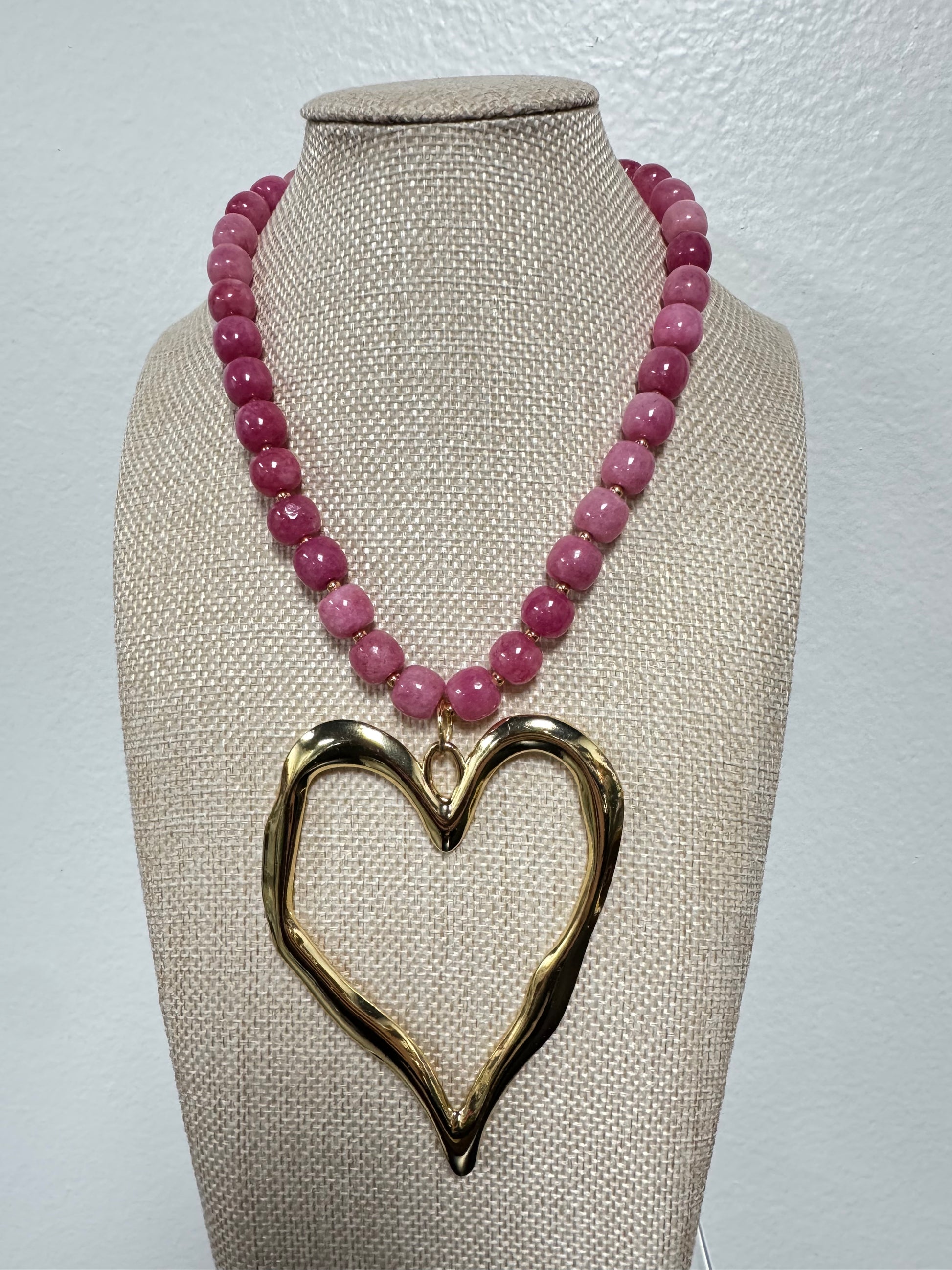This eye-catching necklace features glossy pink beaded stones paired with a sculptural oversized gold heart pendant for the ultimate statement look.