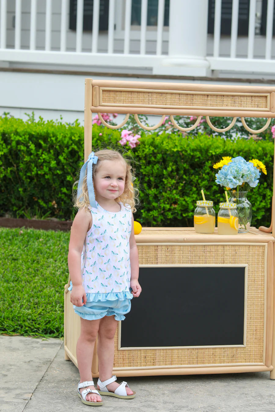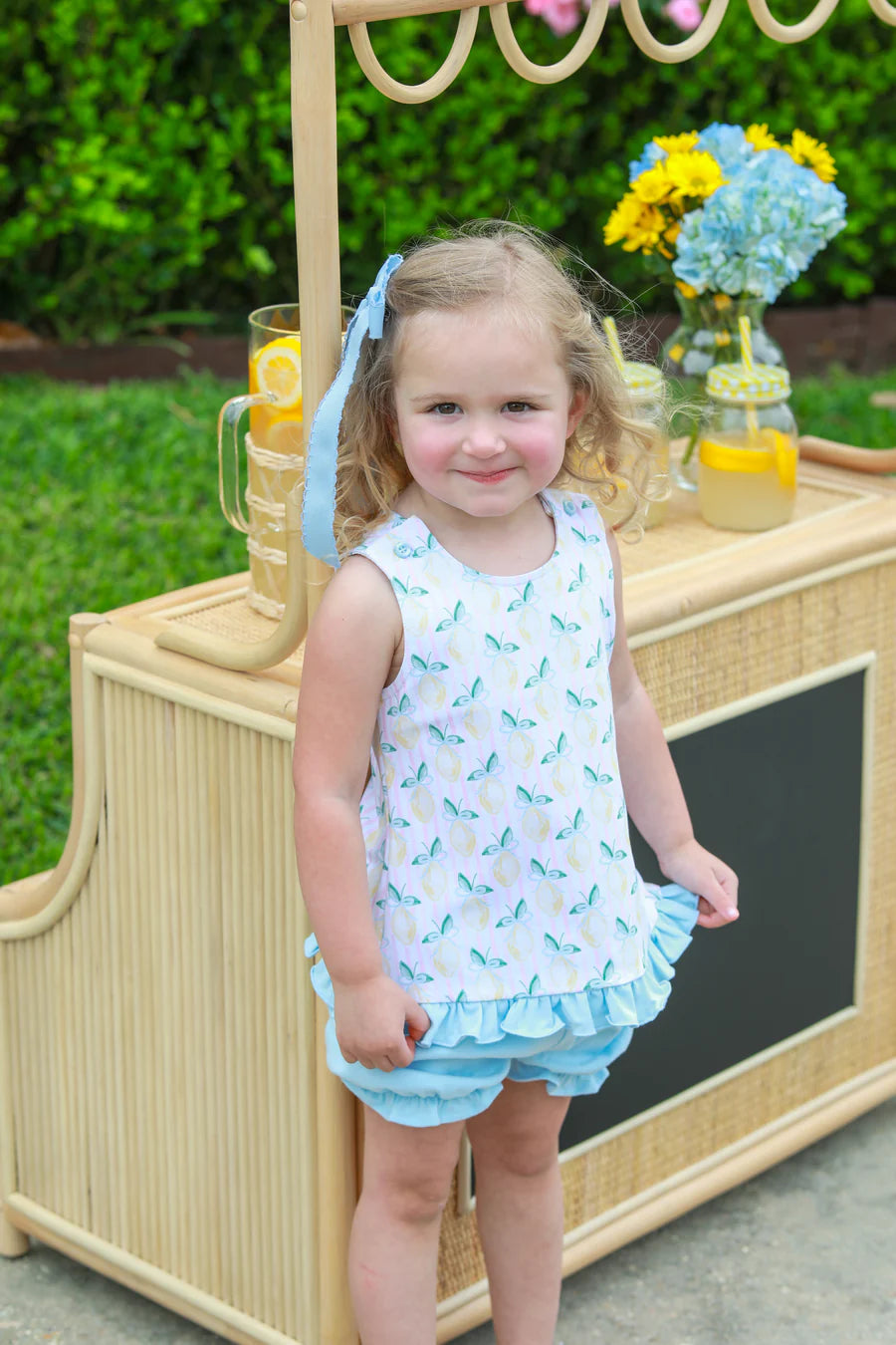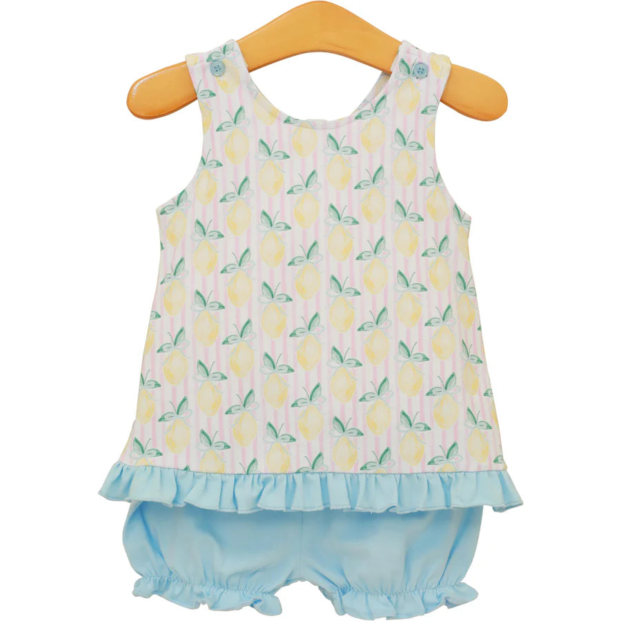 A sweet sleeveless top with a soft lemon print and ruffle hem, paired with matching bloomers light, airy, and perfect for sunny days.