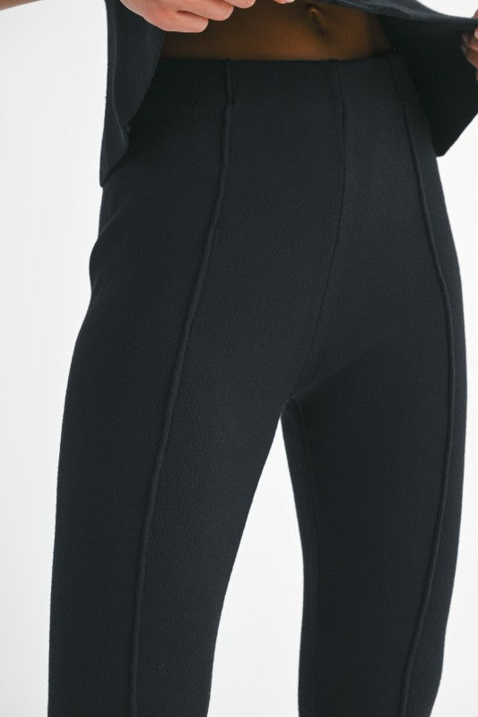 Solid knit off shoulder peplum top with front non-functional button detail and matching flare long pants set.