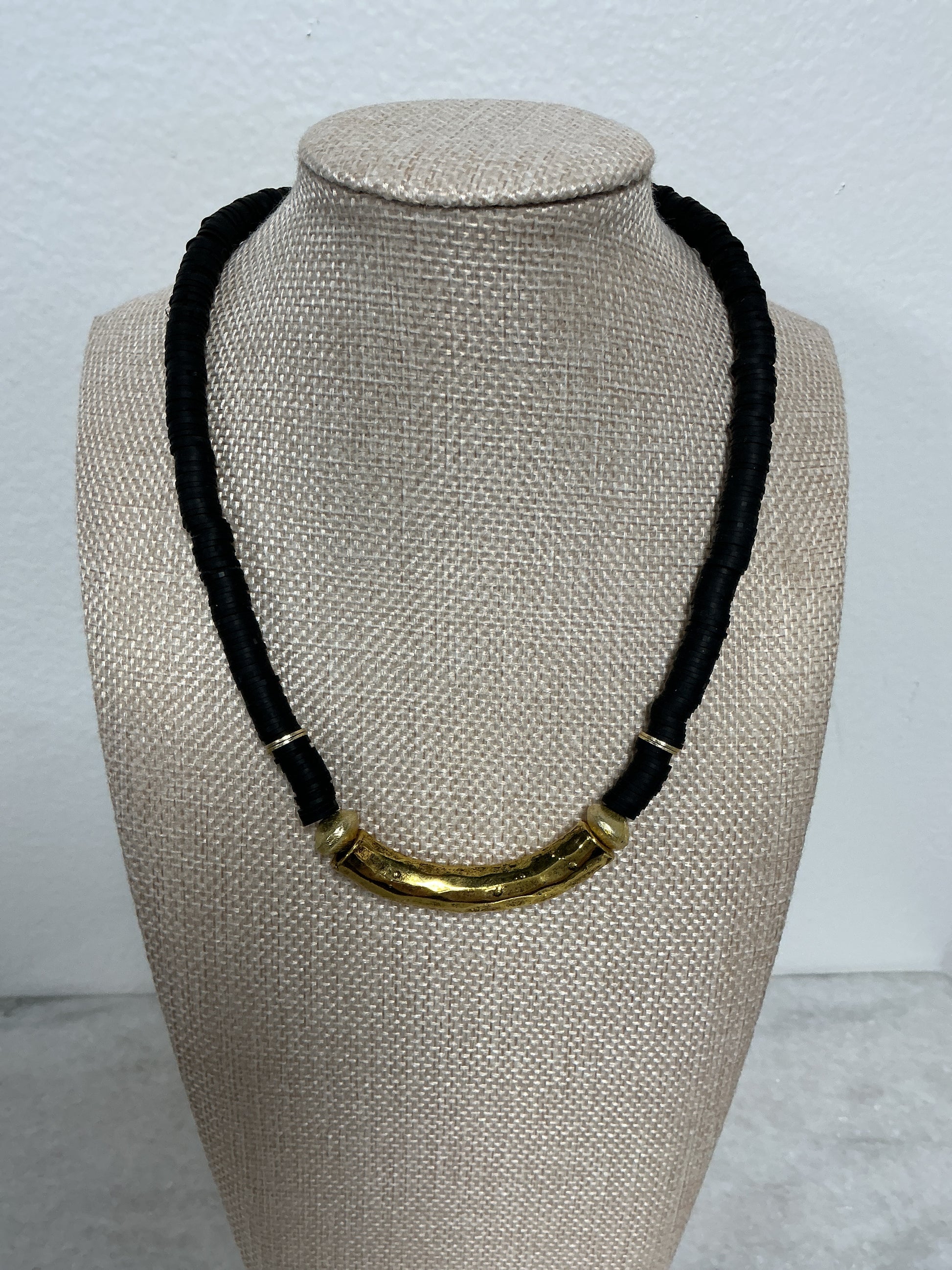 Vinyl necklaces with gold disk accents and gold tube center. Adjustable 16-18” . Various colors available and custom requests. Wear alone or stacked .